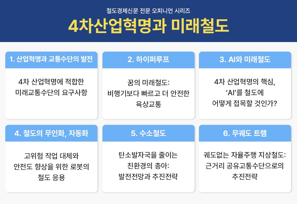 앞으로의 칼럼에서는 분야별 기술전문가들이 4차산업혁명 기술을 신교통철도에 접목하는 방안을 집중 분석하고 제시하고자 한다.