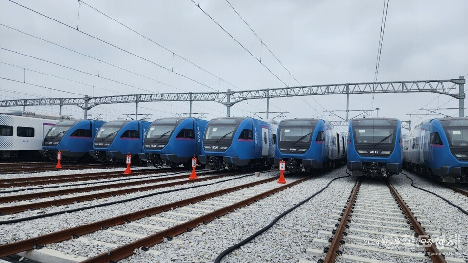 GTX-A 운정차량기지 모습. 5월 초 기지 내 전차선에 전력 공급을 시작했다. 차량 14개 편성은 모두 기지에 입고돼 있다. / 철도경제
