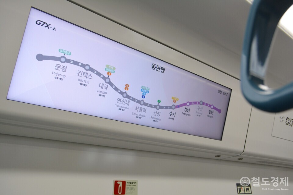 객실 내 표출되고 있는 GTX-A 노선도. / 철도경제